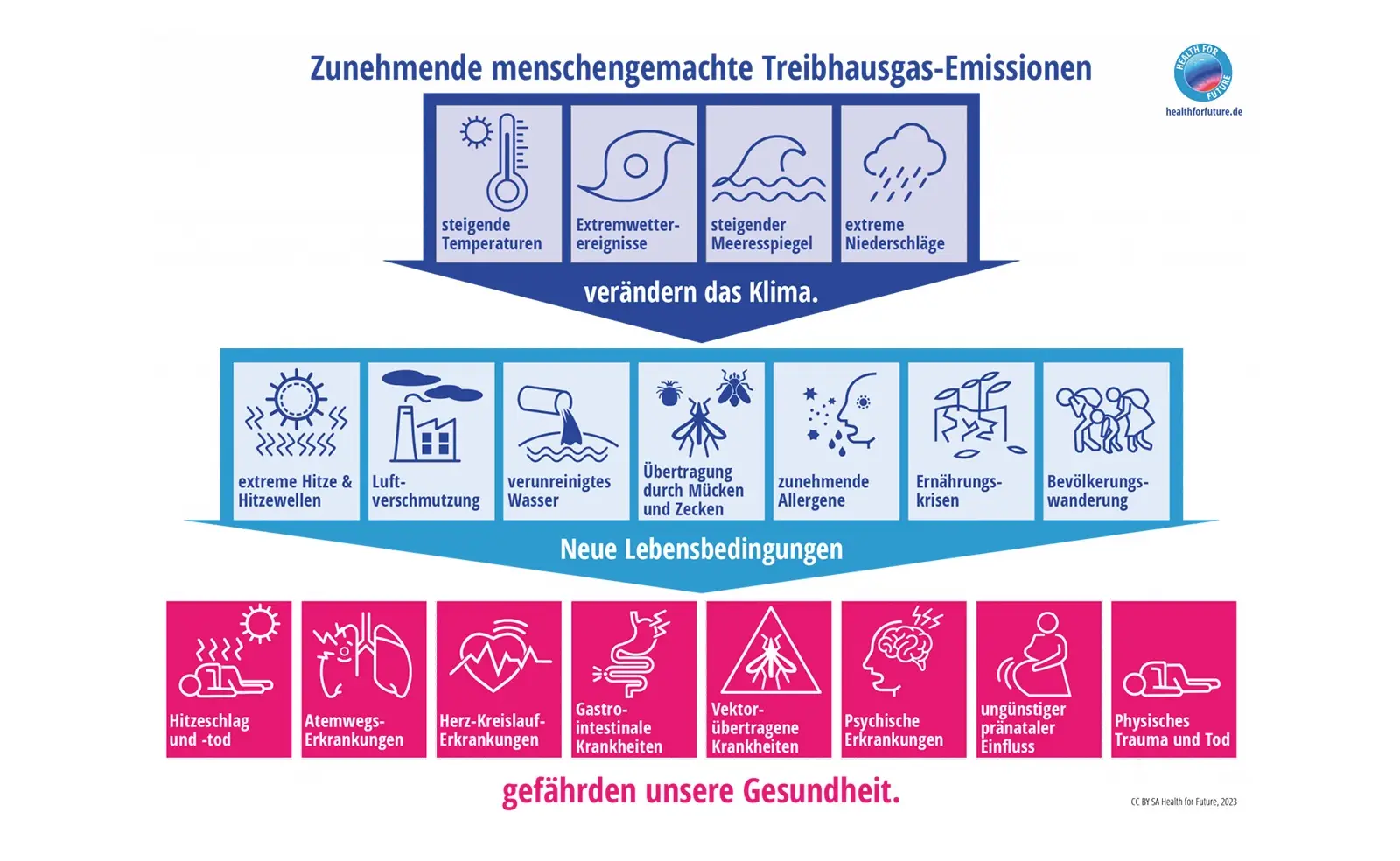 Die Erde bietet den einzigen Lebensraum für uns Menschen und somit die Grundlagen von Gesundheit: „Wasser zum Trinken, Luft zum Atmen, essbare Pflanzen und (…) erträgliche Temperaturen.“ Die Summe und Art der menschlichen Aktivitäten haben jedoch direkten Einfluss auf diese Lebensgrundlagen, wodurch sich einige selbst geschaffene Gesundheitsrisiken ableiten lassen, wie hier am Beispiel der Klimakrise verdeutlicht wird (siehe folgende Abbildung):