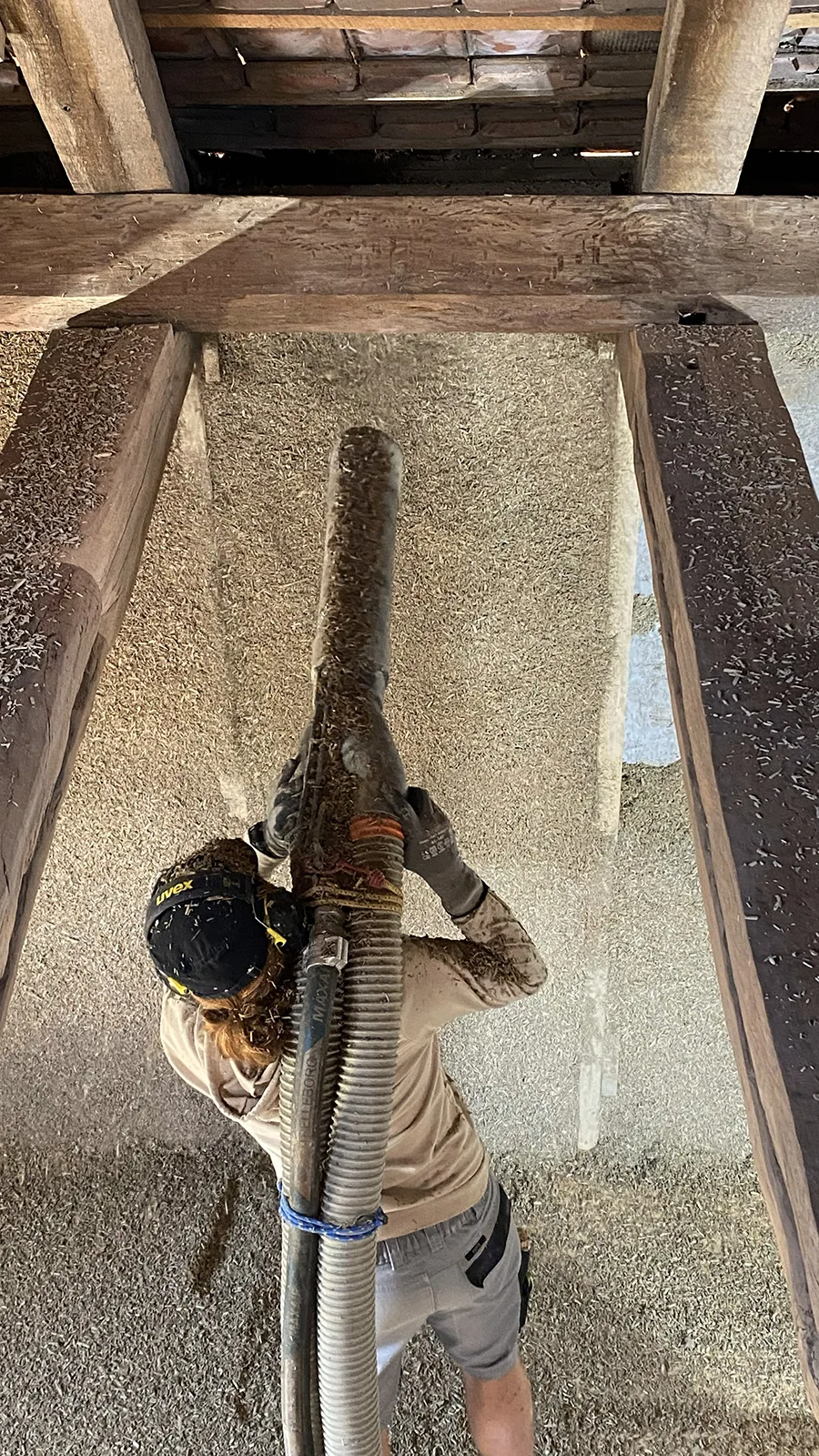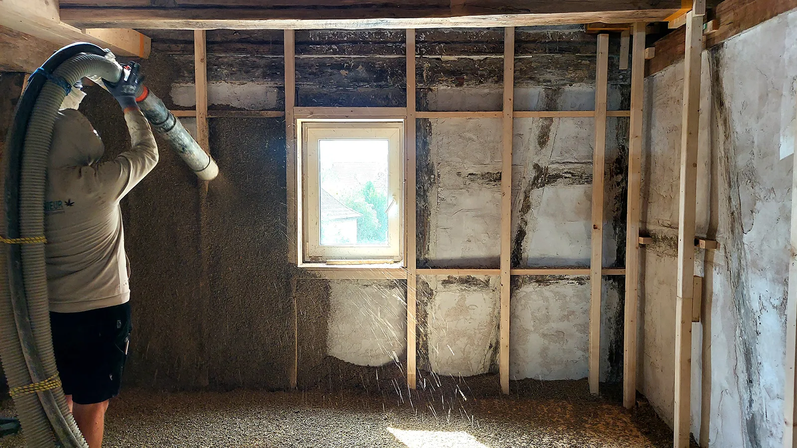 Gesprühter Hanfkalk füllt auch verwinkelte Konstruktionen zuverlässig hohlraumfrei aus.