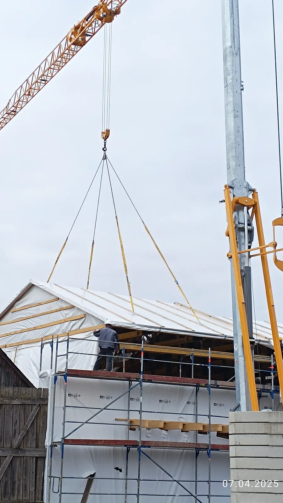 Ein Kran hebt das Dach für die Einhausung auf das Gerüst