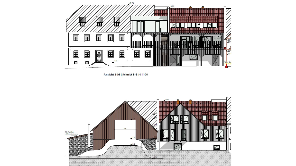 Ansichten des Bestandsgebäudes und des Anbaus