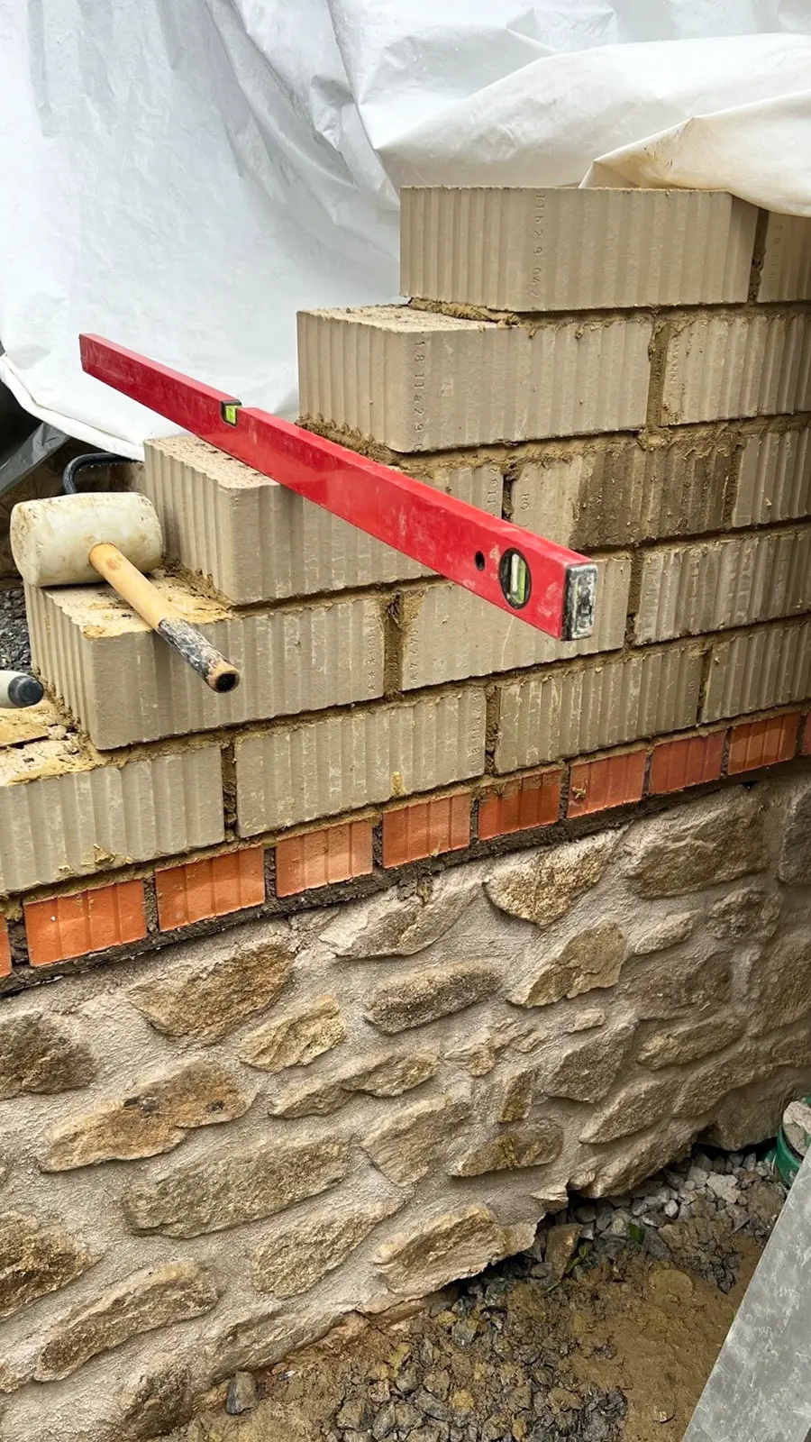 Zum Schutz vor aufsteigender Feuchtigkeit wurden die Sockel für das Lehmsteinmauerwerk nach DIN 18940 ausgeführt (von unten nach oben): ≥ 30 cm hydrophobe, also wasserunlösliche Materialien (hier Granitbruchsteine) / horizontale Sperrschicht / ≥ 5 cm wasserfeste Materialien (hier gebrannte Ziegel).