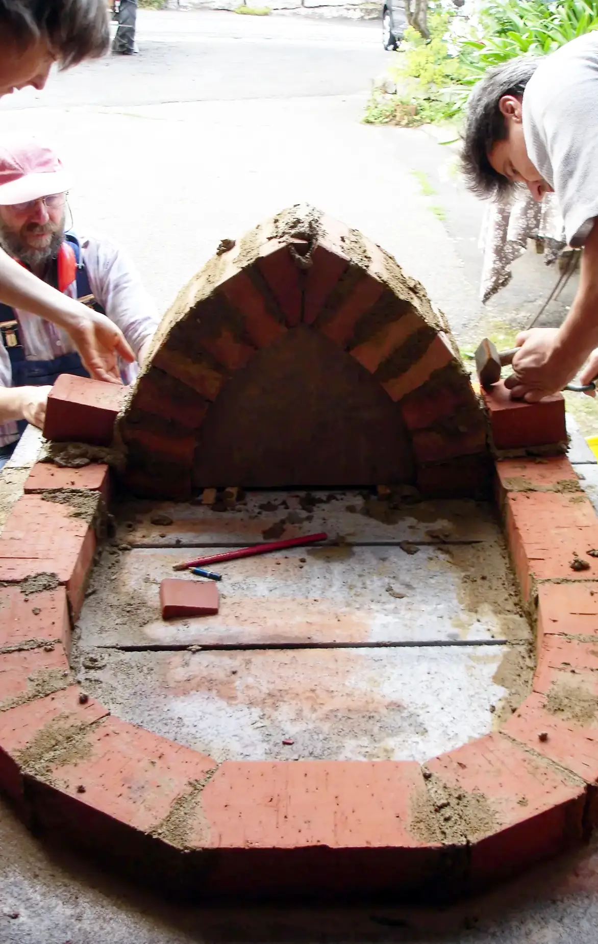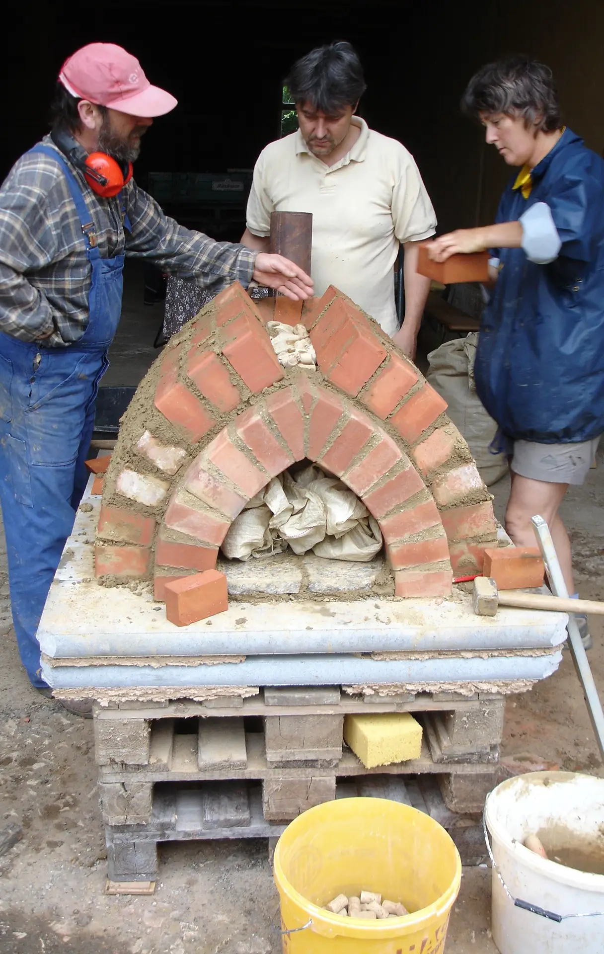 Alle freuen sich1 Ofenportal und erste Korpusschicht gemauert2 Der Ofenrohrbogen wird eingesetzt 3 Die Schlusssteine werden eingefügt4 Innenleben eines Lehmofens5 Der Oberputz ist getrocknet6 Alle freuen sich