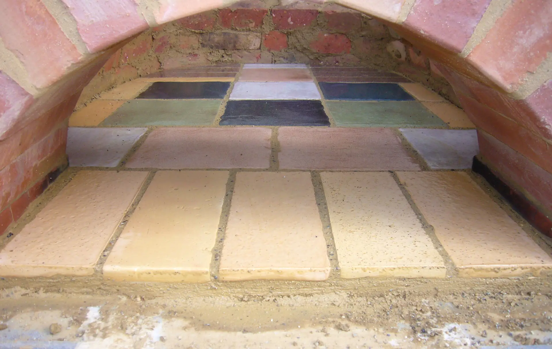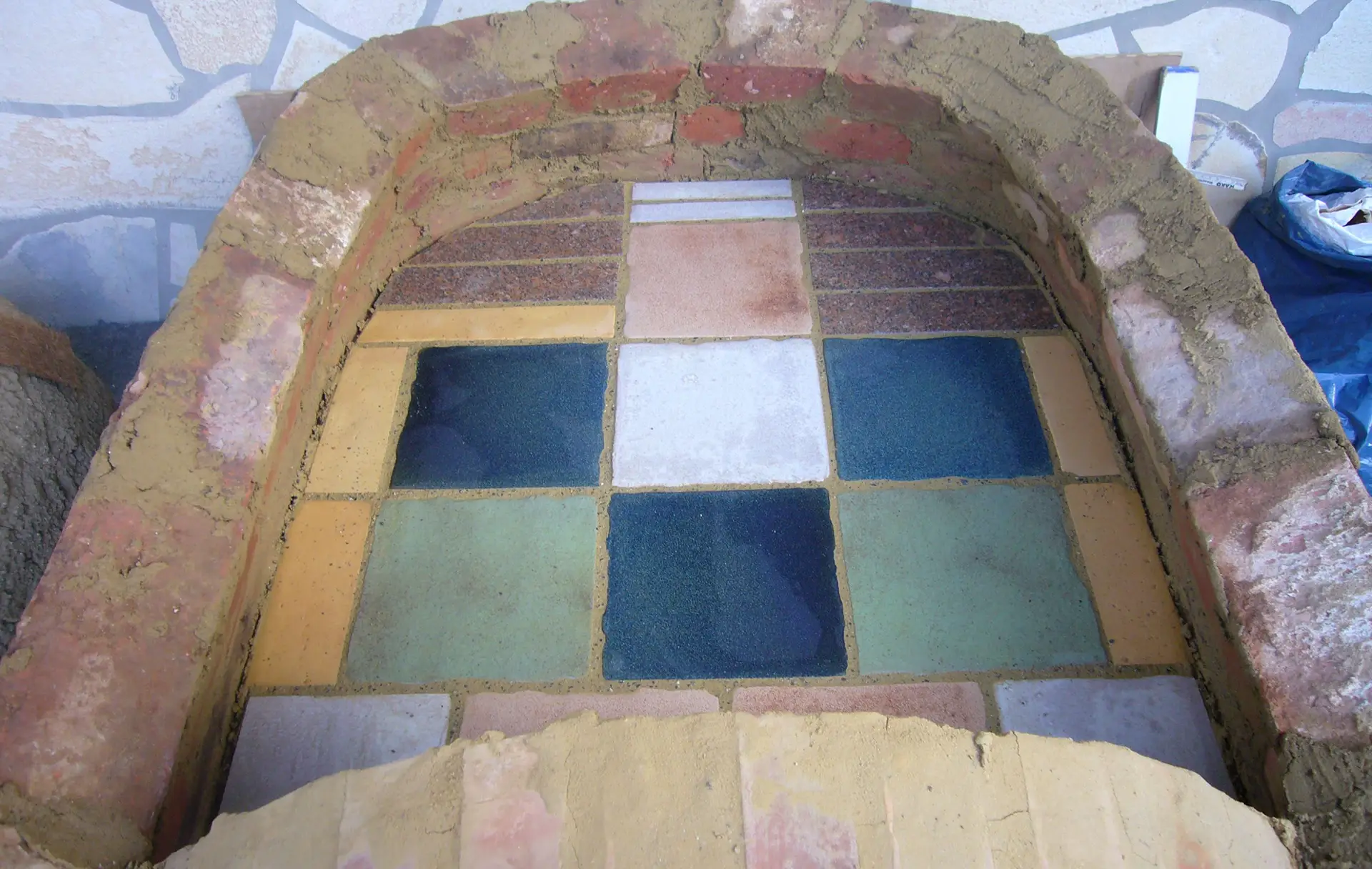 - „Fußbodenfläche“mit Fliesen/Schamottesteinen belegen und mit Lehm ausfugen.