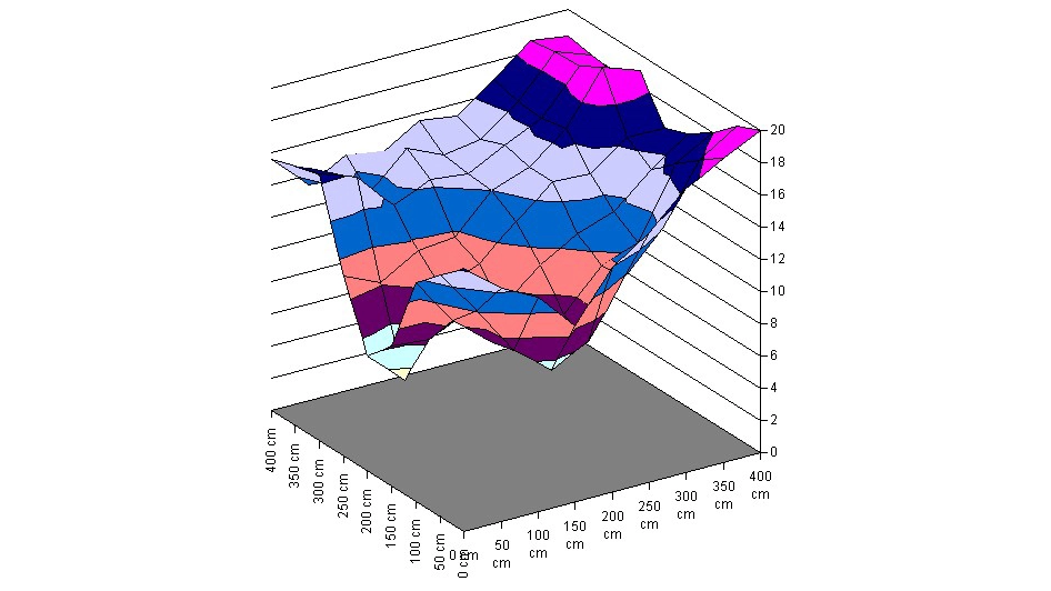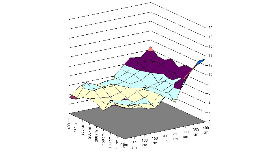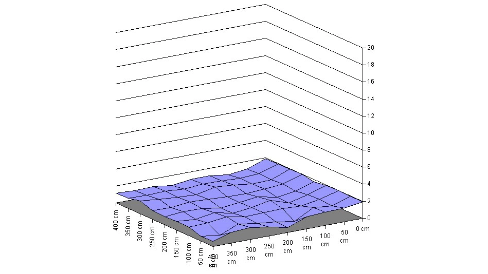 The measurement points were defined in a grid of 50 x 50 cm (20 x 20 in) over an area of 4 x 4 m (13 x 13 ft), corresponding to 81 measurement points. The probe was placed in a plastic holder, which in turn was attached vertically to a two-by-four. In this way, distortions of the Earth’s magnetic field caused by the instrument could be excluded.