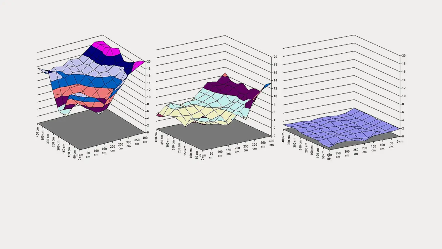 The measurement points were defined in a grid of 50 x 50 cm (20 x 20 in) over an area of 4 x 4 m (13 x 13 ft), corresponding to 81 measurement points. The probe was placed in a plastic holder, which in turn was attached vertically to a two-by-four. In this way, distortions of the Earth’s magnetic field caused by the instrument could be excluded.