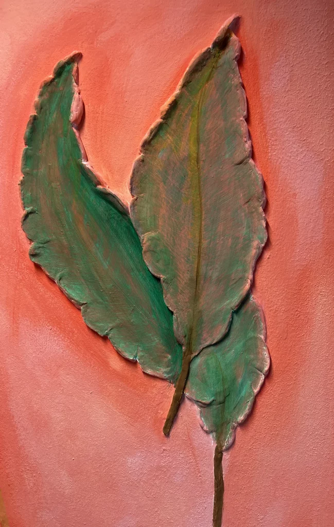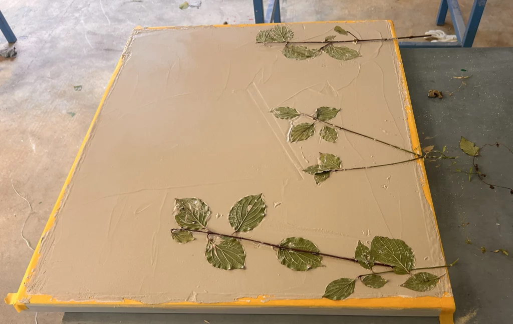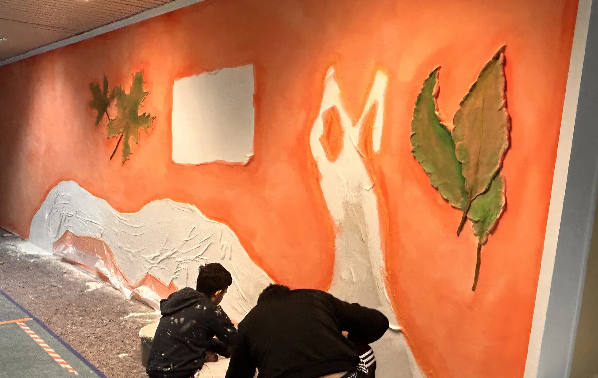 Zunächst errichteten wir eine Trockenbau-Vorwand mit einer Holz-Unterkonstruktion, die die Schüler*innen selbstständig planten und montierten. Diese Fläche wurde anschließend mit einem ruhig wirkenden Lehmfeinputz versehen – als ausgleichender, harmonischer Gegenpol zur Wandfläche dahinter. Denn auf der zurückspringenden Wand trugen wir Lehmspachtel auf, den die Schüler*innen mit Blättern, Zweigen und Ästen strukturierten. Diese wild-natürliche Gestaltung erzeugte eine plastische, organische Oberfläche, die den Naturbezug unserer Arbeit sichtbar macht. Besonders kreativ wurde es bei der Modellierung von Ästen aus Gips, die anschließend mit Lasuren farblich gestaltet wurden – ein Teil der künstlerischen Auseinandersetzung mit Form und Farbe. In Zusammenarbeit mit den Schreinerklassen fertigten wir darüber hinaus Holzbuchstaben mit dem Kürzel unserer Schule, JDLS (Johannes de la Salle) sowie eine hochwertige Holzverkleidung.