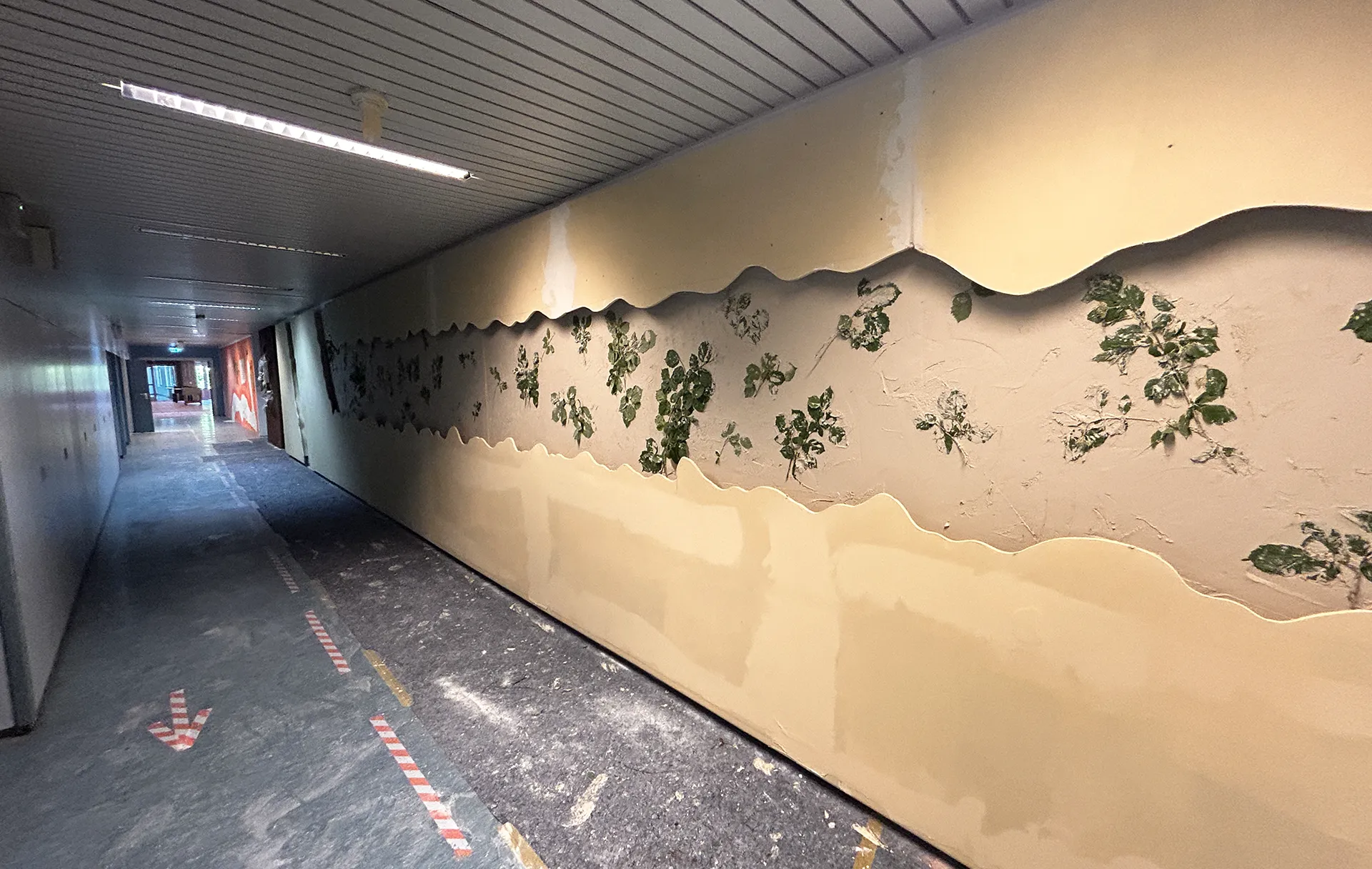 Ein besonders gelungenes Beispiel dafür war die Gestaltung unseres Schulflurs, den wir mit einer Klasse gemeinsam umgebaut und künstlerisch gestaltet haben. Der Gang war zuvor ein funktionaler, farbloser Durchgangsbereich. In einem mehrwöchigen Projekt wurde er zu einem Ausdruck ökologischen und gestalterischen Arbeitens.