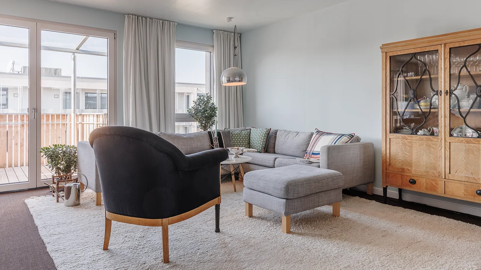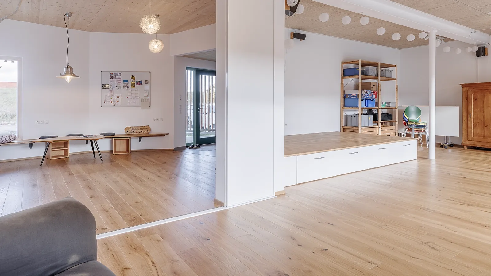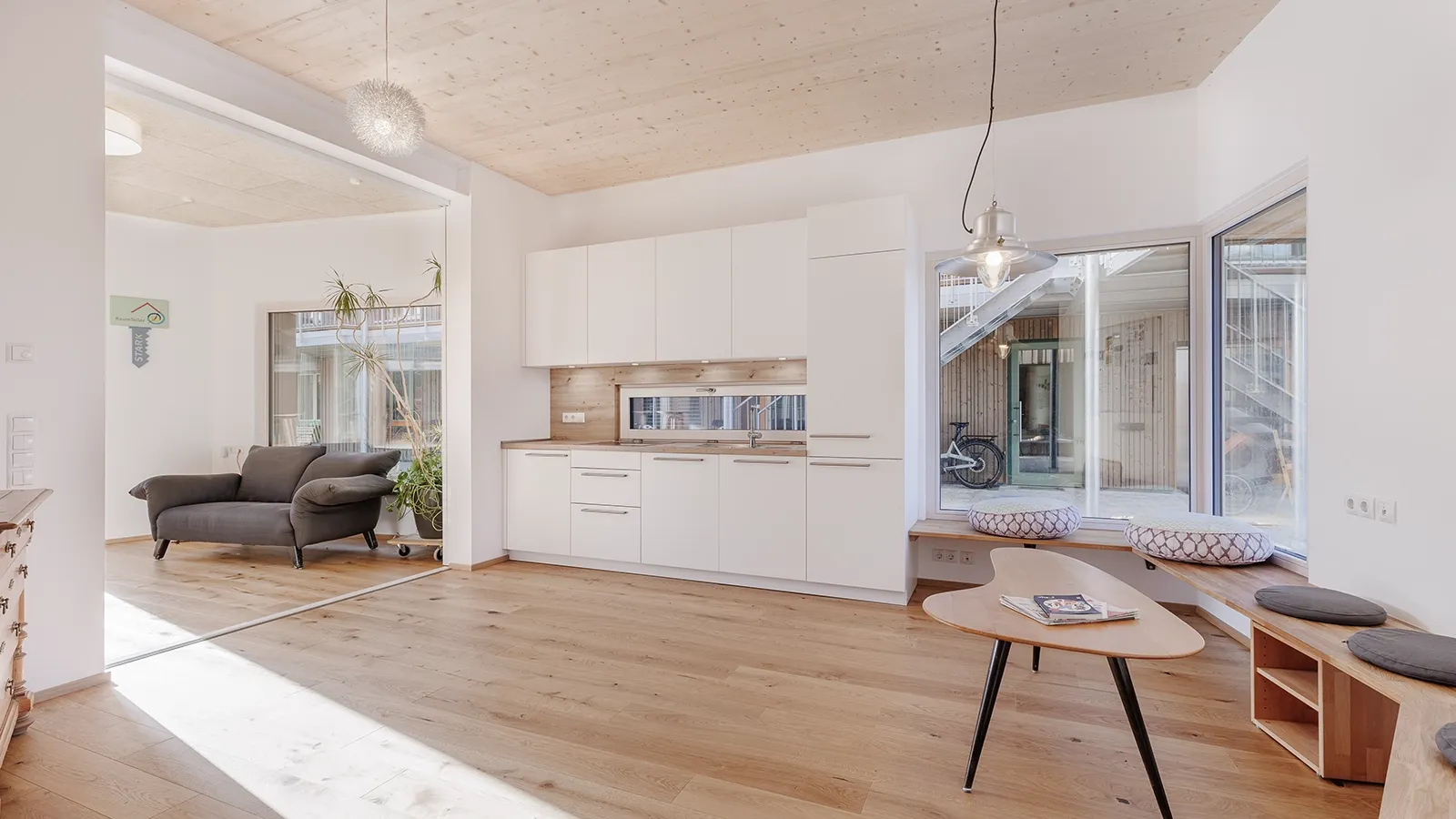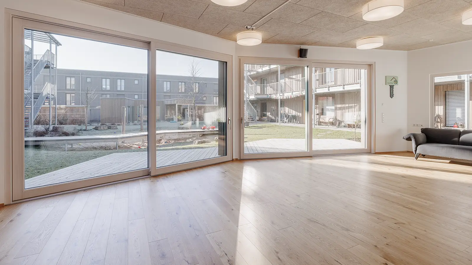 3 Blick aus dem Gemeinschaftsraum in den Innenhof4 Wohnzimmer einer Obergeschosswohnung5 Wohnbereich mit Durchblick zum Arbeitszimmer und auf den Balkon6 Gemeinschaftsraum. Bühnenbereich und abtrennbare Wohnküche7 Gemeinschaftsraum: Wohnküche