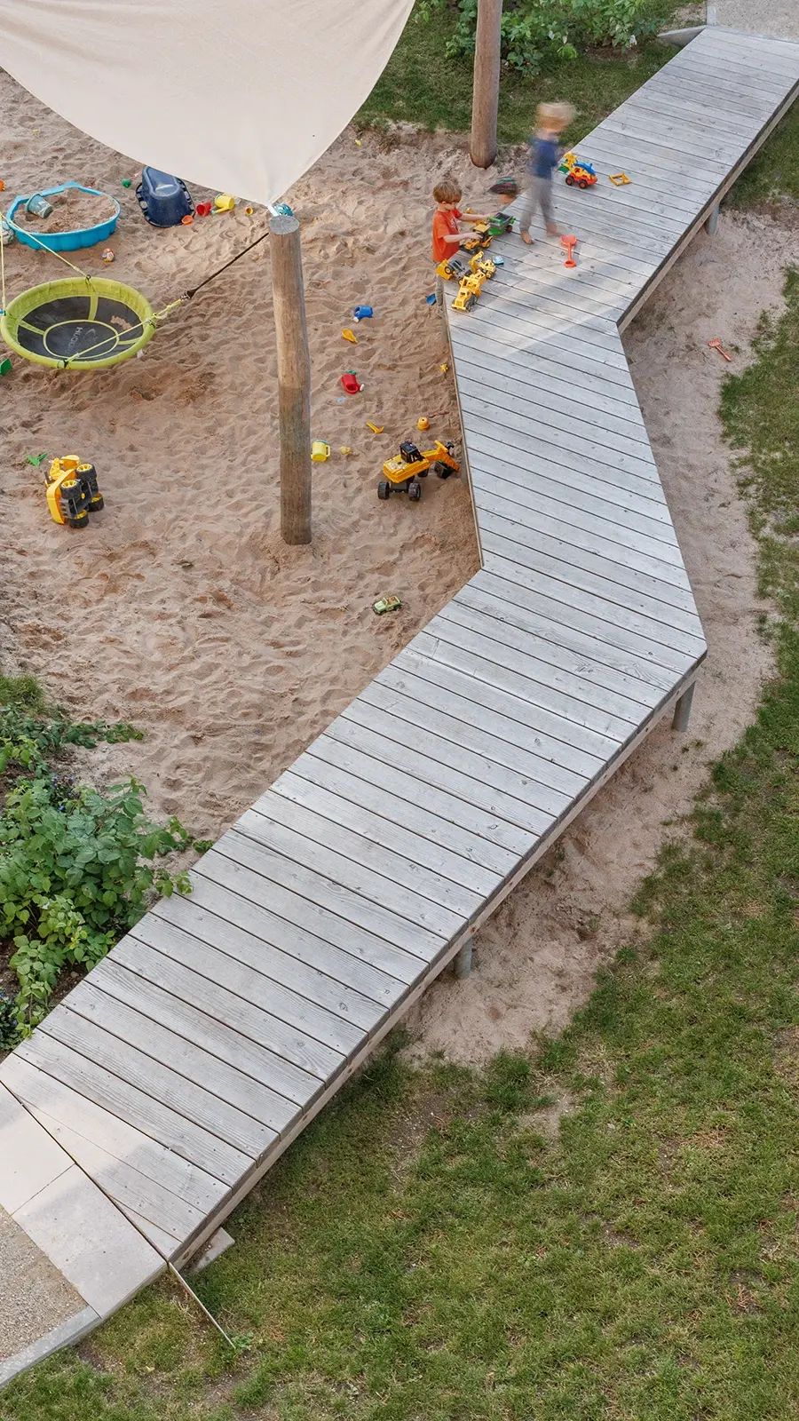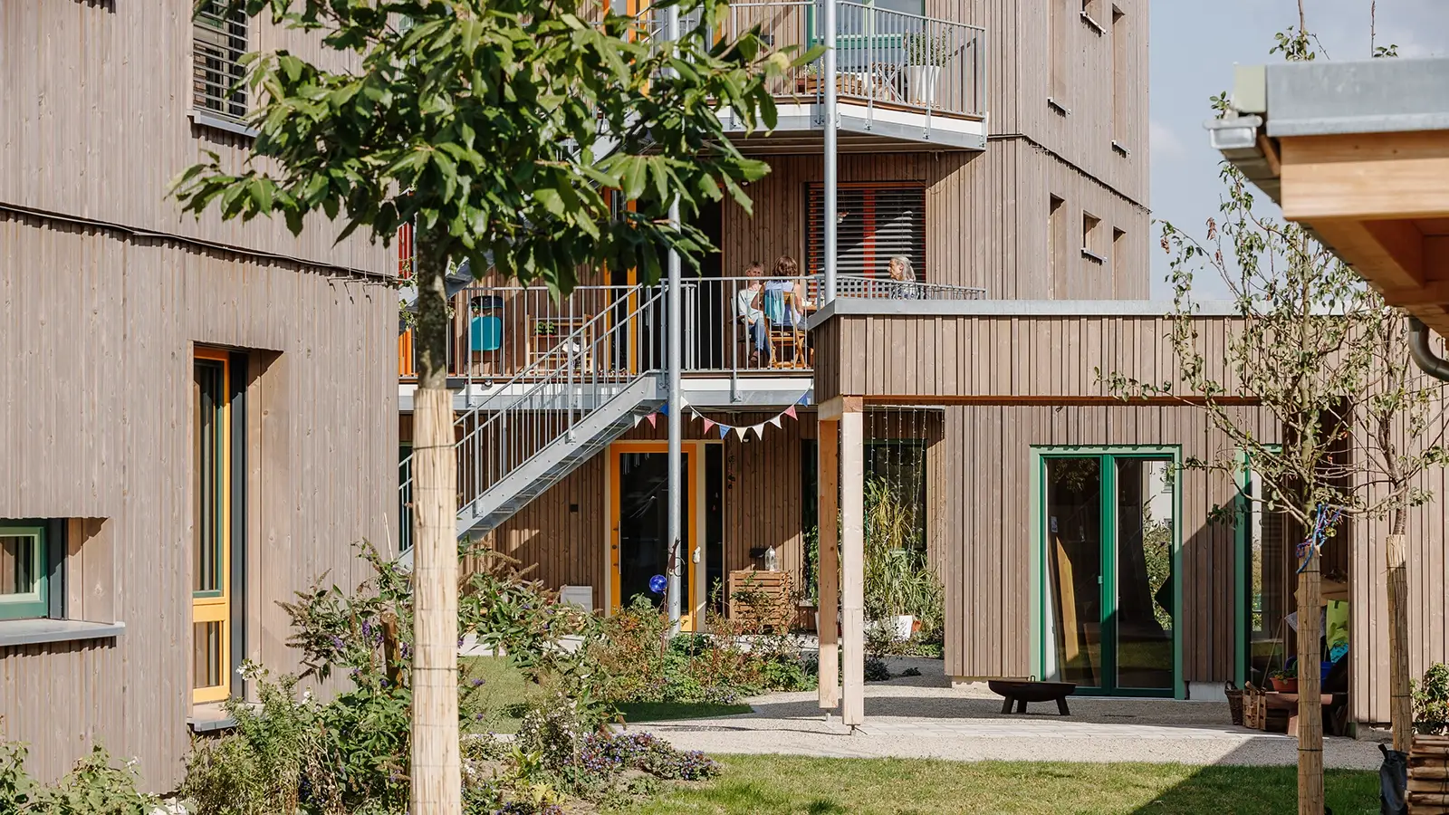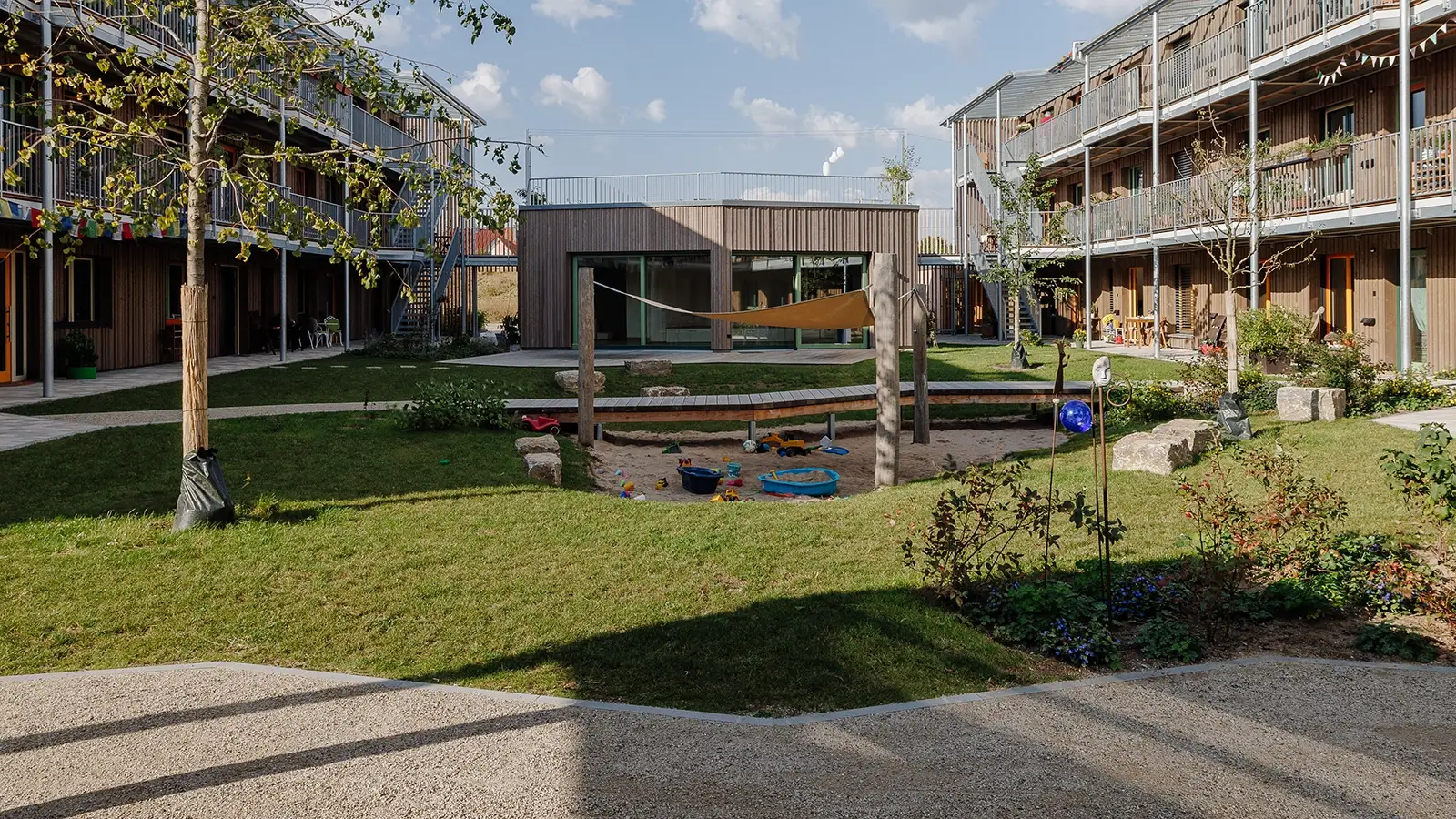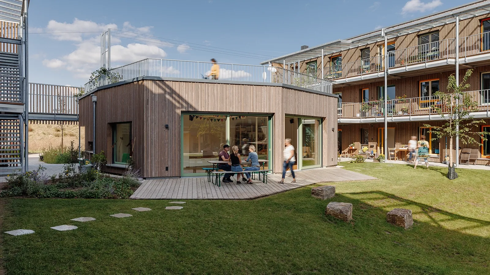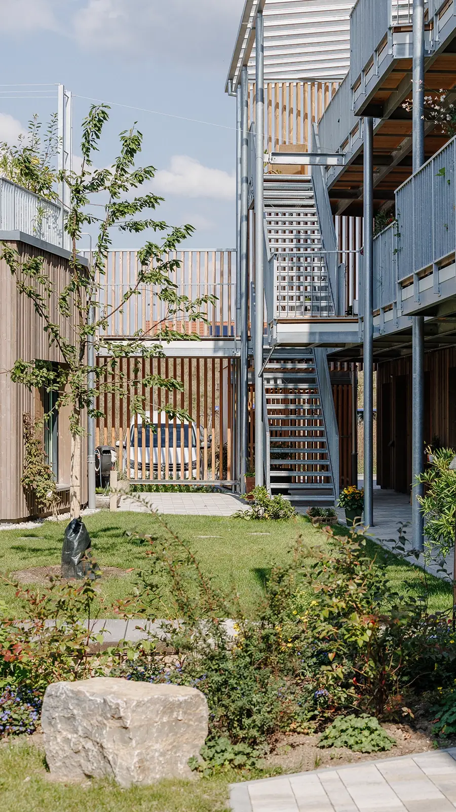 Zentrales Element des Wohnkonzepts ist der Innenhof – im Norden begrenzt vom Gemeinschaftshaus, im Süden vom Werkelhaus und an den Seiten von Wohnriegeln umgeben. Zur Straßenseite hin schützt ein semitransparenter Holz-Screen den Innenhof, während er sich zum Wohnweg hin öffnet und das gesamte Quartier einlädt. Private Terrassen und Balkone sind zum öffentlichen Raum hin ausgerichtet. Die Wohnungen werden über Laubengänge erschlossen, die zum Innenhof zeigen und bereits beim Heimkommen ein Gefühl von Gemeinschaft vermitteln. Klingeln und Briefkästen sind vor dem Gemeinschaftshaus in eine überdachte Begegnungsfläche integriert und bieten erste Kontaktmöglichkeiten. Schon der Zugang zur Wohnung eröffnet den Blick in den Innenhof und lädt dazu ein, mit verweilenden Nachbarn ins Gespräch zu kommen. Vor den Wohnungstüren erweitern sich die Laubengänge zu kleinen Aufenthaltsbereichen, die den Austausch mit den Bewohnern des gegenüberliegenden Wohnriegels fördern. Heute leben dort rund 80 Menschen – vom Säugling bis ins hohe Alter.