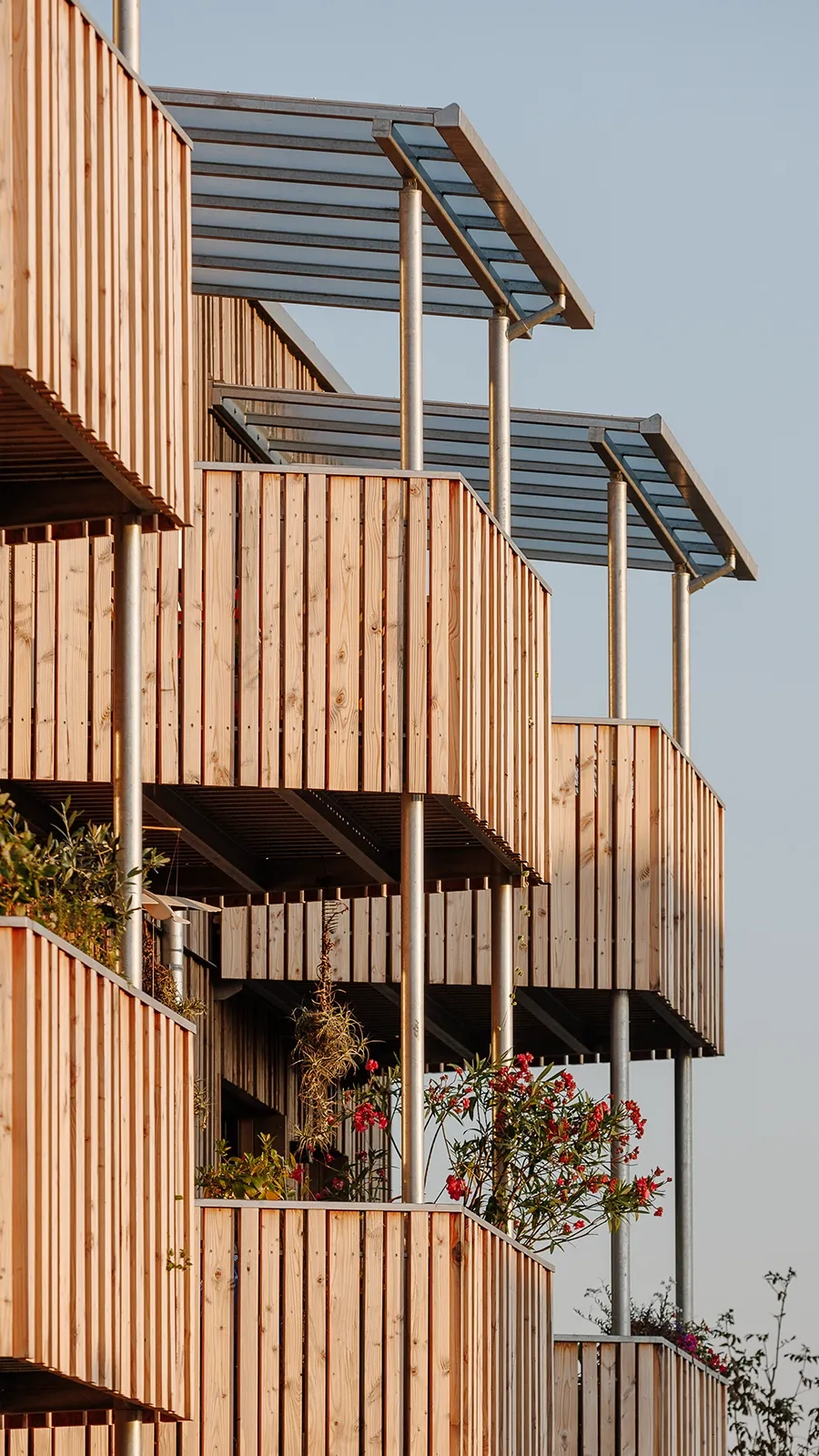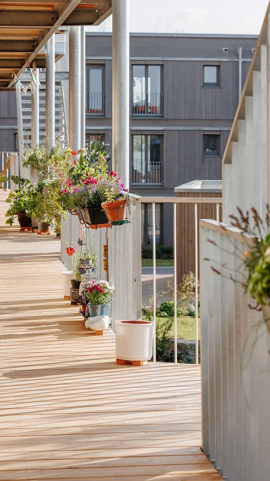 8 Das Herzstück. Der Gemeinschaftsraum9 Leben zum Innenhof10 Laubengang als Begegnungsort11 Private Balkone12 Hier wohnen die Fahrräder13 Spielerische Verbindung14 Erschließung der Laubengänge15 Laubengang