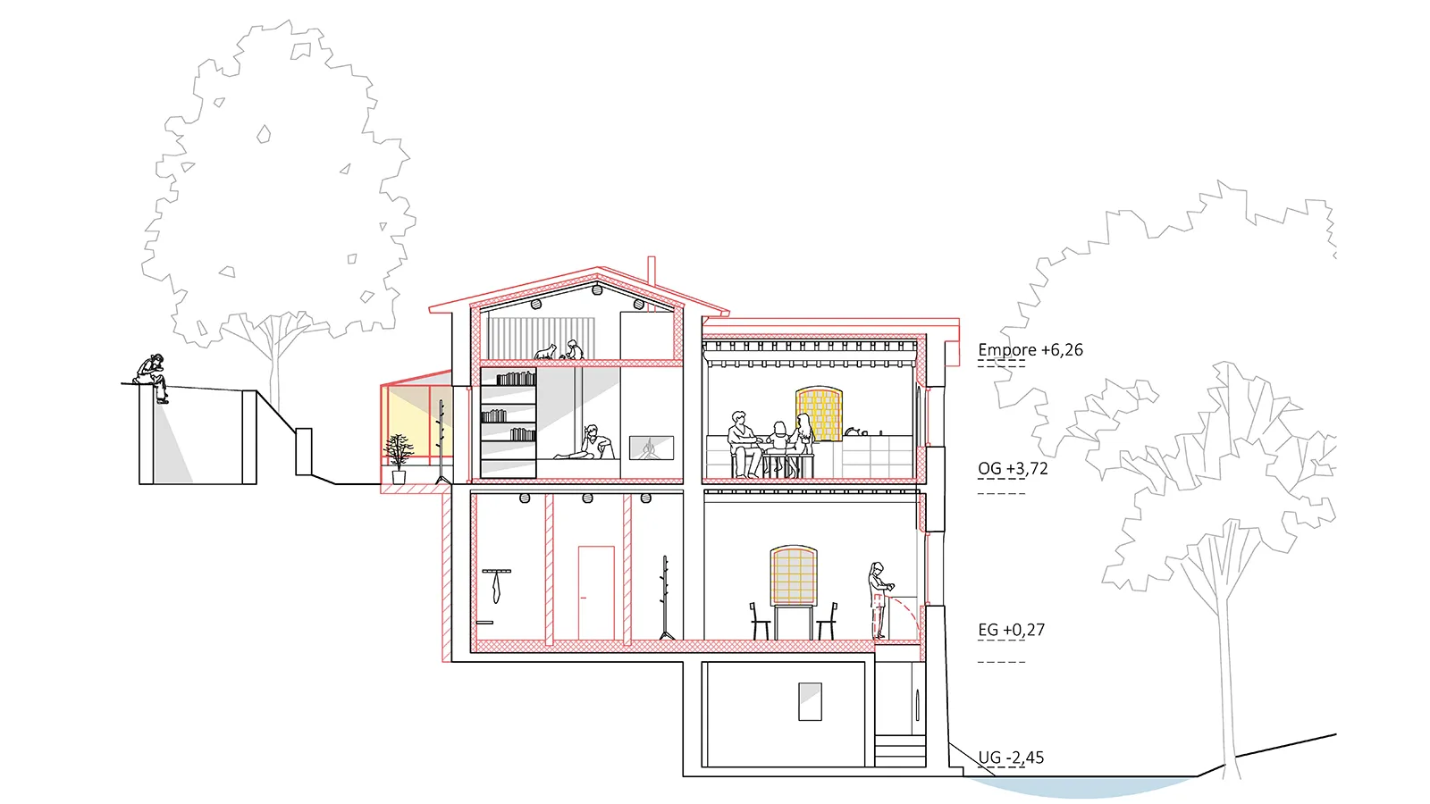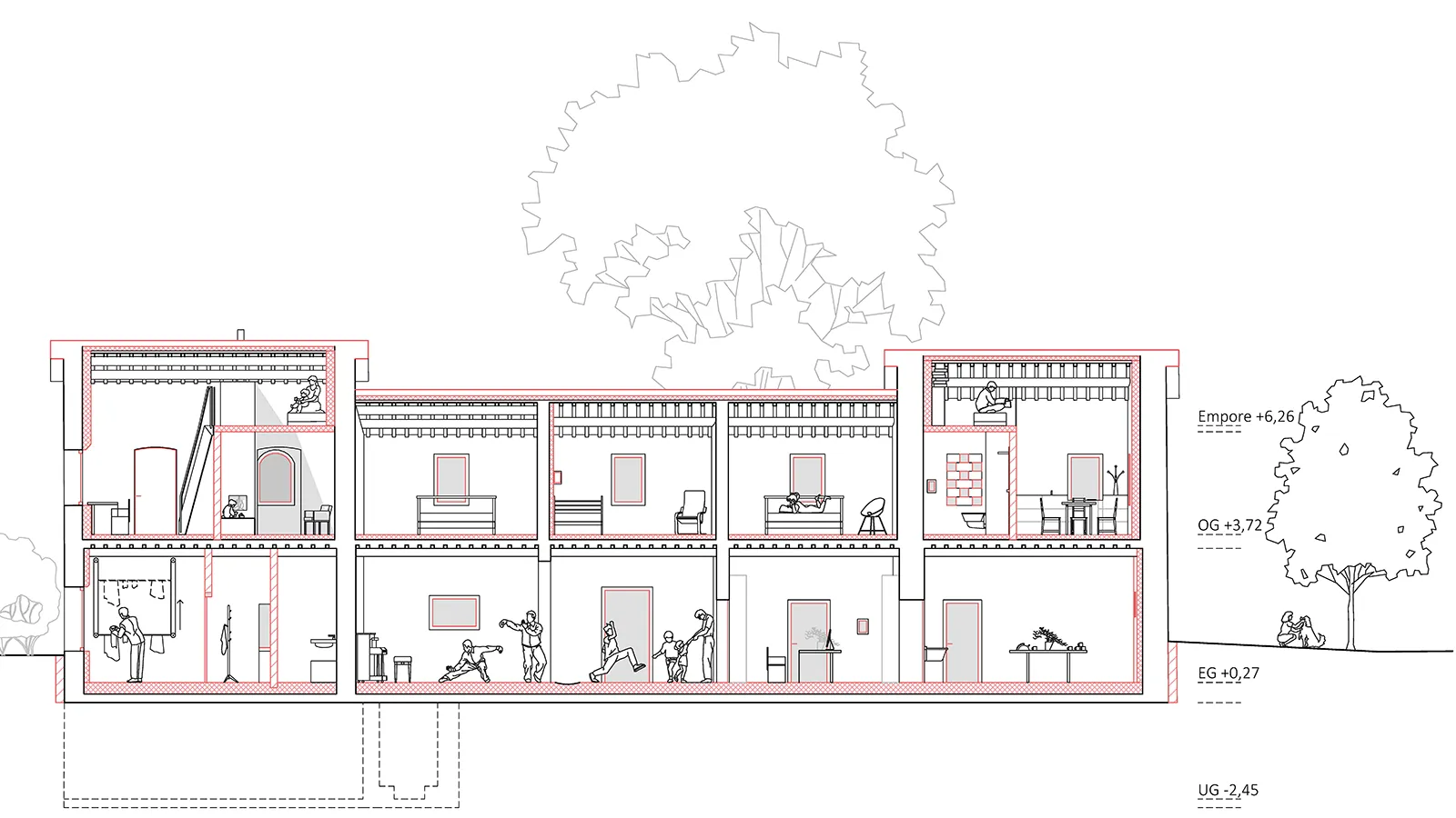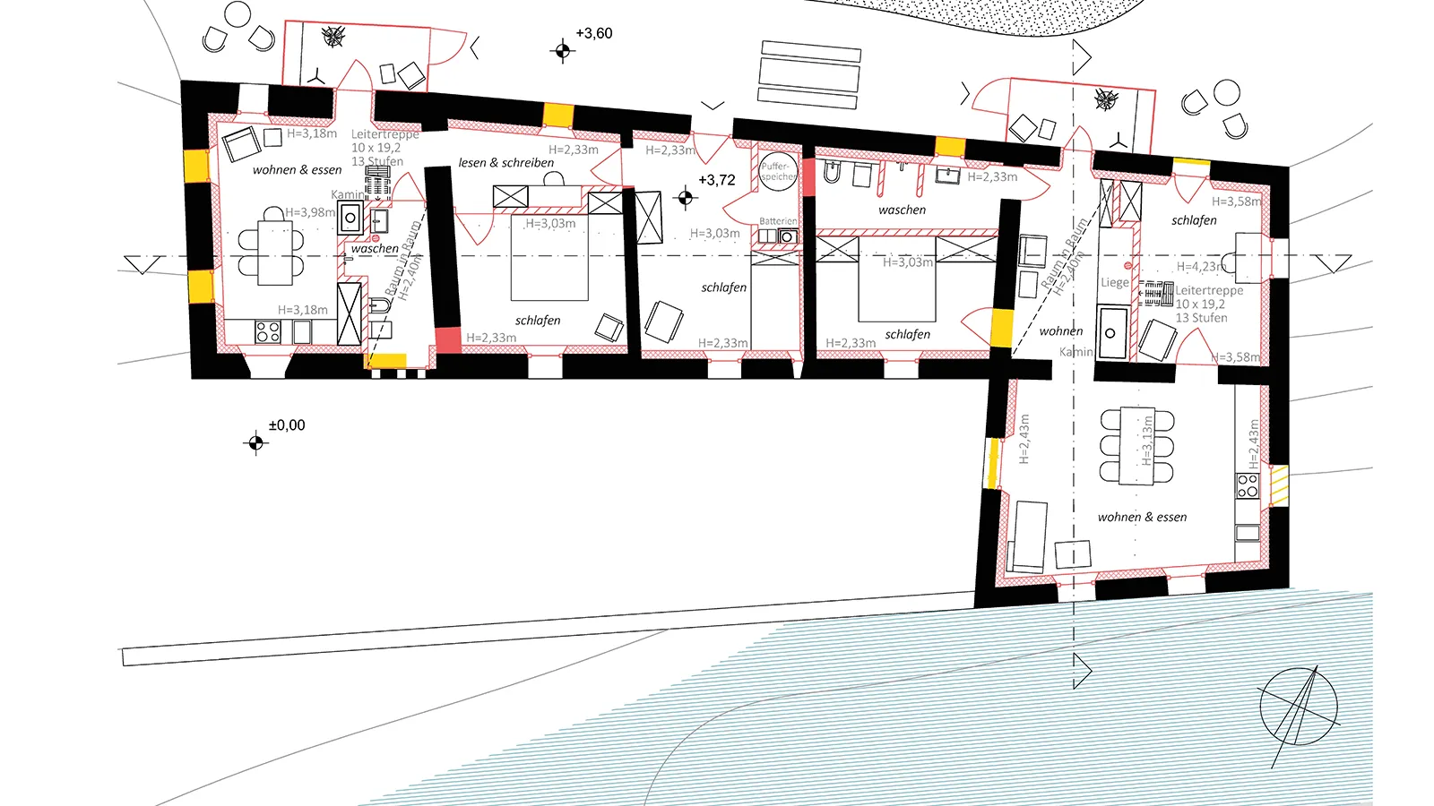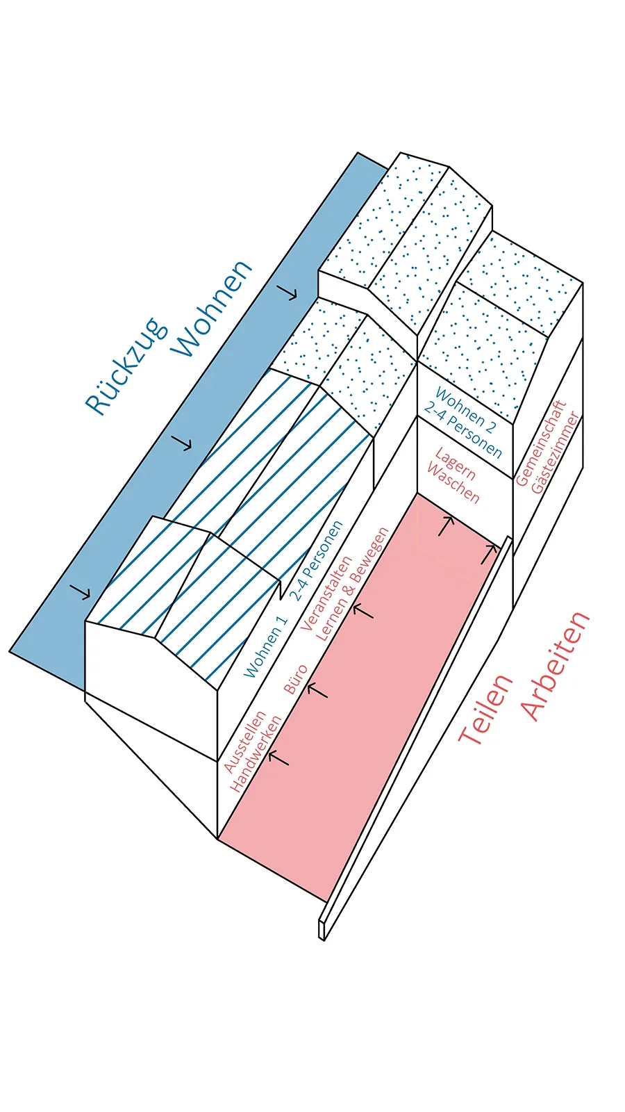 6 Trennung von Rückzug/Wohnen im Obergeschoss und Teilen/Arbeiten im Untergeschoss