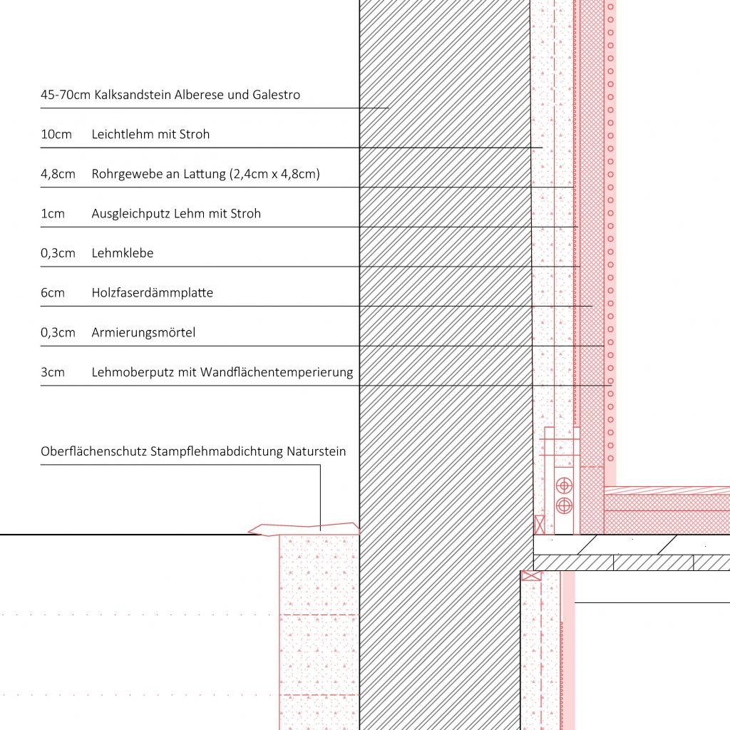Die Sanierungsarbeiten bestehen größtenteils aus Dämm- und Abdichtungsarbeiten. Hierfür wird Lehm als Grundbaustoff verwendet. Ungebrannter Lehm schafft ein herausragendes Raumklima durch seine diffusionsoffenen und hygroskopischen Eigenschaften sowie durch die Fähigkeit, Schadstoffe aus der Raumluft zu binden. So kann er Feuchtigkeit aus den Bestandsmauern aufnehmen und wieder abgeben und sorgt für eine ideale Raumluftfeuchte. Dämmungen werden mit Leichtlehm und Holzfasern ausgeführt. Abdichtungsmaßnahmen der erdberührten Wände und der Bodenplatte erfolgen mit Stampflehm. Die Verwendung von natürlichen Materialien sichert eine gesunde, schadstofffreie Raumluft und steigert damit die Gesundheit und das Wohlbefinden der Bewohnerschaft. Außerdem können diese Baumaterialien natürlich gewonnen und an ihrem Lebensende recycelt oder kompostiert werden, was die Gesundheit der Erde erhält.