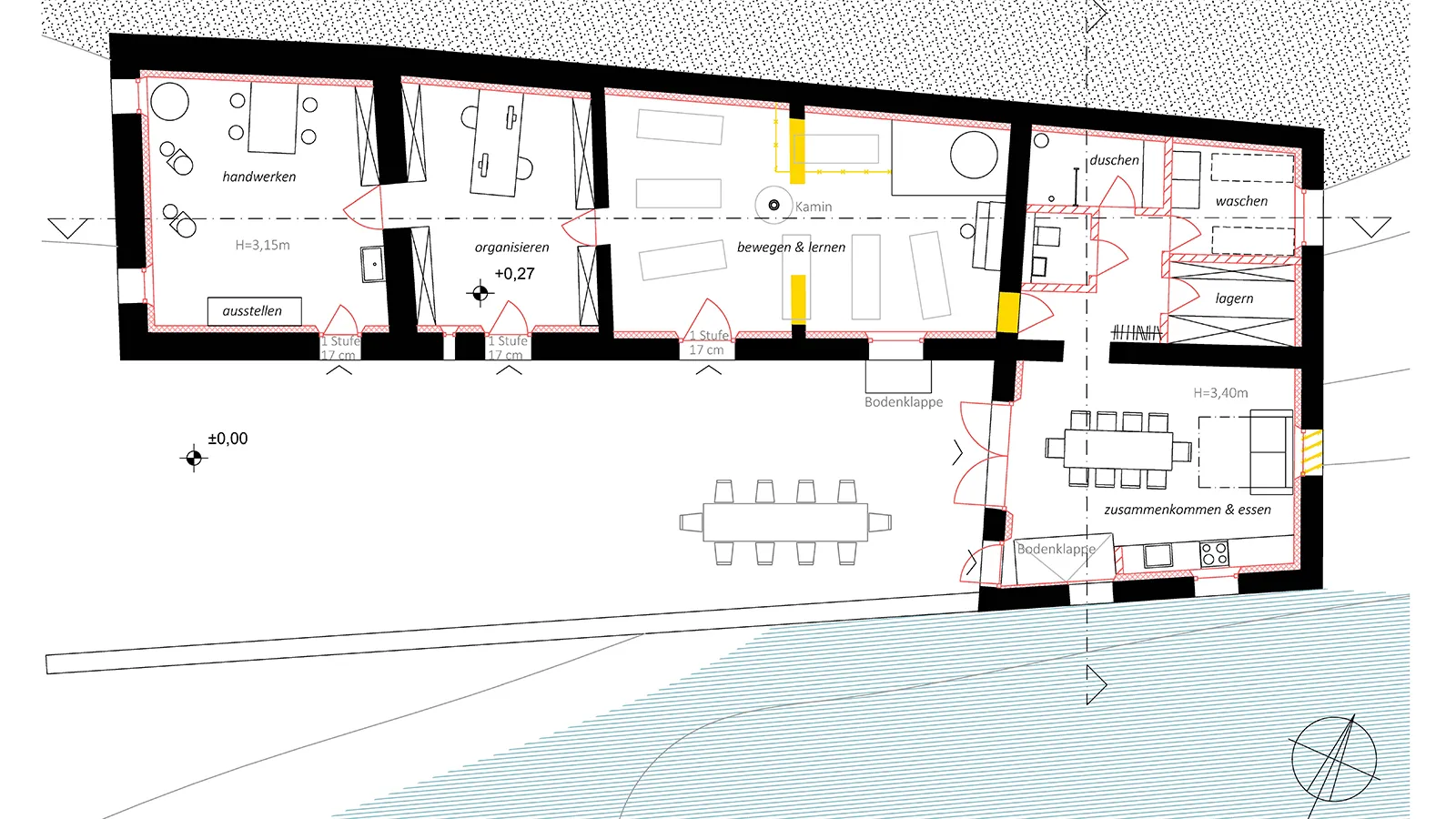 Das Planungs- und Ausführungskonzept sieht vor, zwei Wohneinheiten, Gemeinschaftsräume, einen Veranstaltungssaal für Kurse und Seminare, eine Werkstatt, sowie im Außenraum eine Versammlungsstätte im ehemaligen Wasser-Sammelbecken unterzubringen. So entsteht ein Ort, der sich für Gäste öffnet und seinen Bewohner*innen die räumlichen Voraussetzungen für diverse Betätigungen bereitstellt.